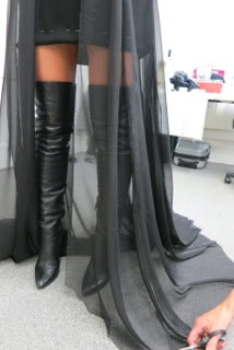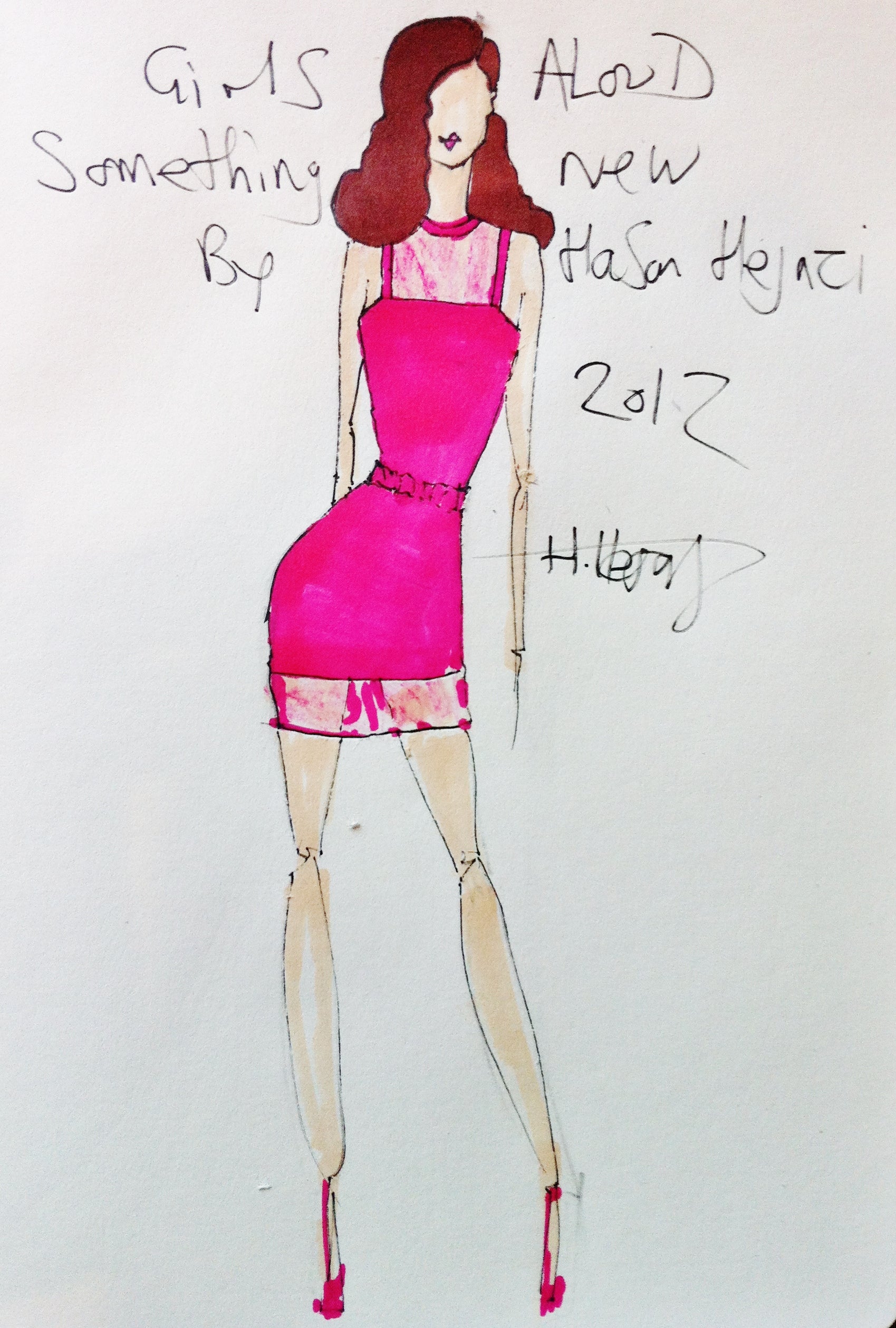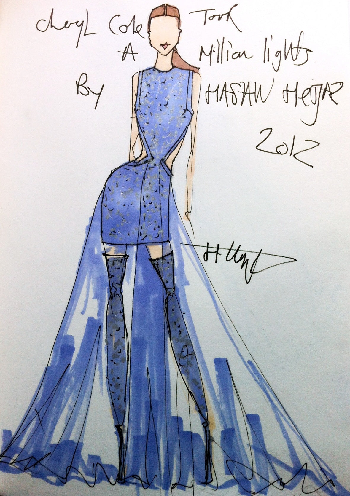 Hasan has collaborated with superstar Cheryl several times. Firstly Hasan was asked to design a stage outfit for a performance of the single "Under The Sun" in 2012. The statement look featured silk jogger trousers emblazed with pop art icons, paired with a colourful leopard cropped blouse. Later that year Hasan designed a etherial purple silk gown with a chiffon train for the "Million Lights" tour. You can see the creation during Cheryl's performance of "3 Words" and "Parachute" as well as being featured as the cover of the DVD. Lastly for the reunion of Girls Aloud, Hasan designed 5 identical hot pink, silk jersey dresses which made for a striking cover for the comeback single "Something New."