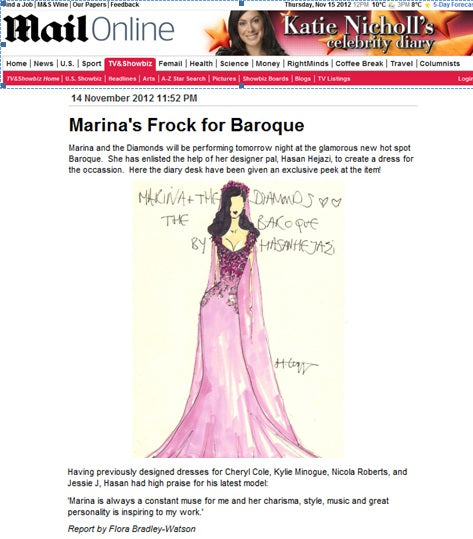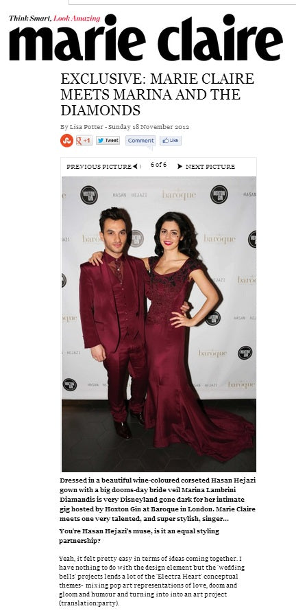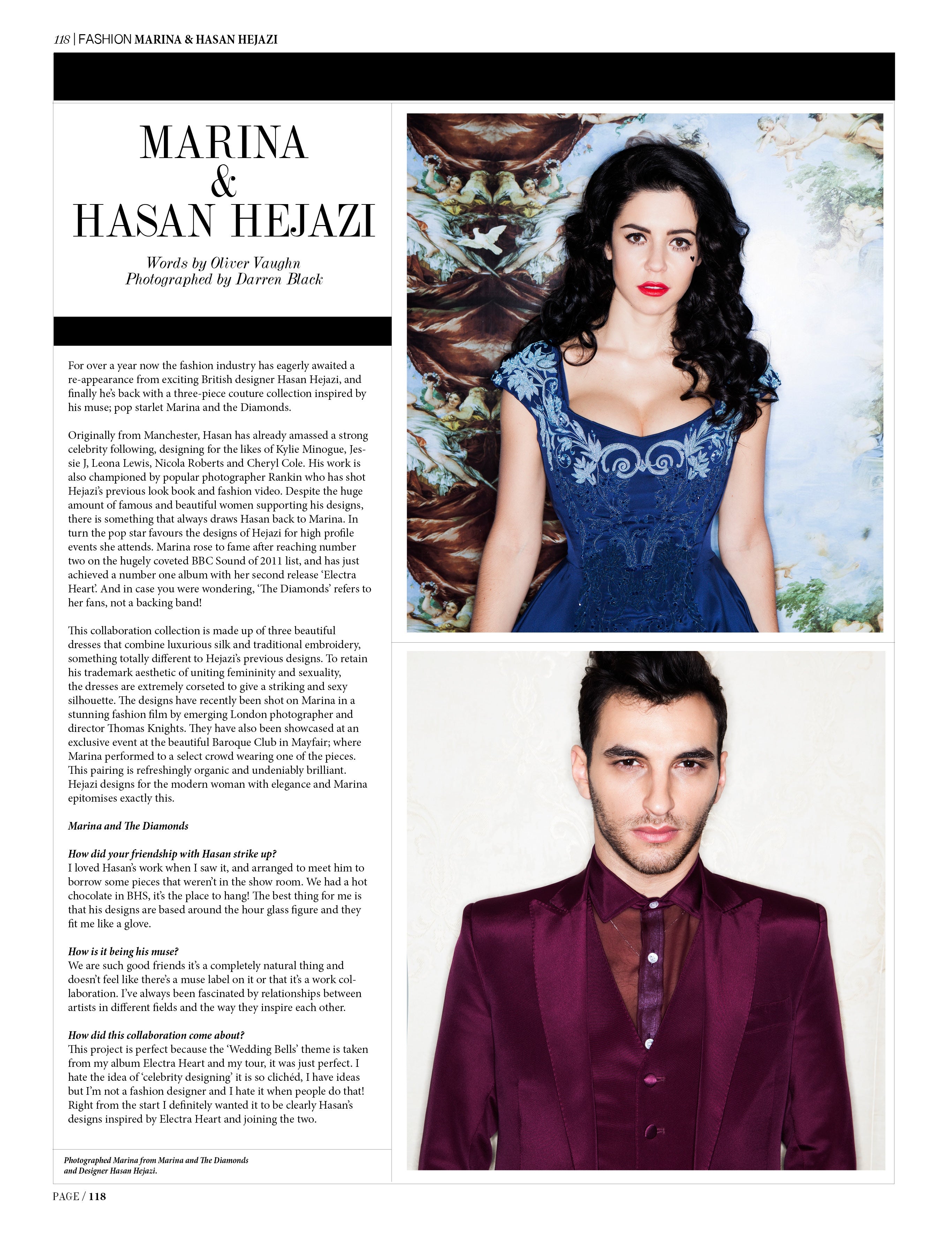 Singer Marina Diamandis (and the Diamonds) stars in this fashion story by Tim Bret-Day and fashion film by Thomas Knights. The project focuses on a marriage scene between the designer Hasan, and his muse Marina wearing custom made bridal inspired dresses. The project was launched in 2013 with a party filled with wedding cake, special guests and free flowing champagne.